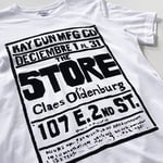 All items are hand printed in our studios in our Portland, OR and Bozeman, MT. Images are painted onto a screen with drawing fluid and screen filler, hand pulled in very short editions. We use water-based ink, with no photochemical process or burning involved, no computer, and no automated print mechanisms. No shirt is without its own individual flaws and will vary slightly from shirt to shirt.